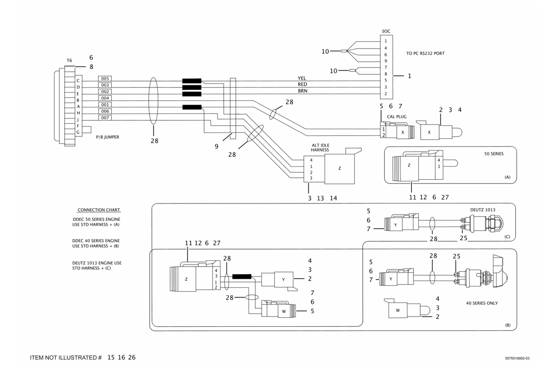項目零件號名稱數(shù)量備注再制造件號L COMPLETE _ASSEMBLY 5575519900 CALIBRATION SET 1 TRANS. DIAGNOSTIC HARNESS 1 5541065500 CABLE 1 6FT D-9M TO D-9FM 2 5541027400 RECEP CONNECTOR 3 CAVITY-2,SIZE 16,MALE,PLASTIC,CABLE MOUNT, DT04-2P (DEUTSCH) 3 5540455500 CONTACT, PIN 10 PIN SIZE 16. AWG 16-18 4 5541027500 CONNECTOR LOCK 3 CONN. LOCK 2-PINDT SERIES 5 5541027200 PLUG CONNECTOR 4 CONN. PLUG 2-SOCKET DT SERIES 6 5540119300 SOCKET 22 SOCKET SIZE 16, AWG 16-18 7 5541027300 CONNECTOR LOCK 4 CONN. LOCK 2-SOCKETDT SERIES 8 5541057200 PLUG 1 PLUG 9 WAY 9 5580001221 HEAT SHRINK.BO. 0.08 W/ADHESIVE 10 5580001220 HEAT SHRINK.BO. 0.16 W/ADHESIVE 11 5541035000 PLUG CONNECTOR 2 MALE, PLASTIC, CABLE MOUNT 12 5541034500 LOCK 2 SECONDARY LOCK-4 POS SOCKET 13 5541034700 CONNECTOR 1 CONN-RECEPT-4 POS-PIN TYPE 14 5541035400 CONNECTOR LOCK 1 SECONDARY LOCK-4 POS-PIN TYPE 15 5537302100 SWITCH 1 PUSH BUTTON 16 3217001011 CONTROL SWITCH 1 2 POSITION/STAY PUT 16 3217000502 CONTACT BLOCK 1 1 SL 1 BR P B 25 5540661600 CABLE LUG 4 TERM-RING 26 5580000051 CABLE 6.30 WIRE-WHT16 27 5534825400 SEALING PLUG 3 SIZE 14-16, AWG 12-16 28 5580001100 SPIRAL HOSE 1.40 SPIRAL WRAP