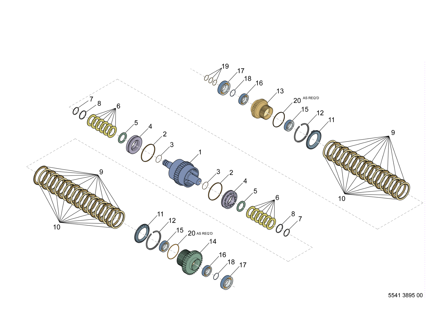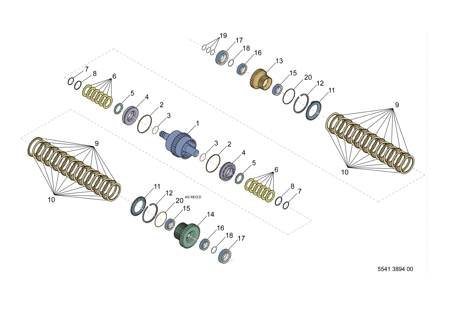 項(xiàng)目零件號(hào)名稱數(shù)量備注再制造件號(hào)L COMPLETE _ASSEMBLY 5541389400 SHAFT 1 SHAFT - 2ND STAGE 1 5541401400 SHAFT 1 2 5541403400 PISTON SEAL 2 PISTON SEAL 3 5541435200 O-RING 2 4 5580008435 PISTON 2 5 5541397400 WASHER 2 6 5541397000 SPRING 12 7 5541399900 RING 2 8 5541397500 RETAINER 2 SNAP RING 9 5533386700 DISK 20 10 6060009348 PLATE 20.00 11 5542018400 PLATE 2 12 5580005236 RING 2 13 5541401600 GEAR 1 14 5541402100 GEAR 1 15 5541402800 BEARING 2 16 6060005719 BEARING 2 17 5580005235 BEARING 2 18 5541399800 RING 2 19 5541869500 SEAL 3 20 5541398500 O-RING 2